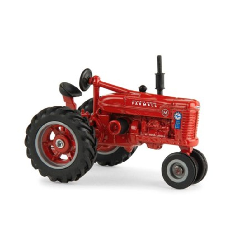 This Farmall M Tractor features a special blue ribbon logo that is printed on its hood. It is constructed with a diecast body with a narrow front axle and soft tires that are mounted on plastic wheels. Great for both collecting and for play!1:64 scale of t