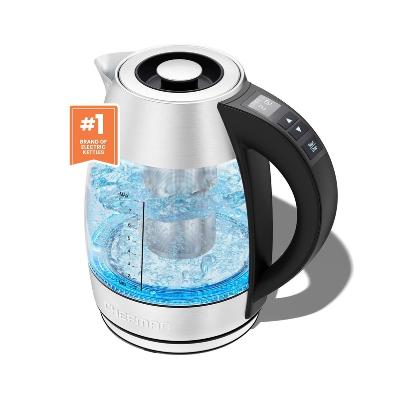 Brewing your favorite hot beverage has never been easier than it is with the Chefman 1.8L Digital Electric Glass Kettle +. With the stainless steel reusable tea infuser included, you can brew your favorite loose-leaf or bagged teas directly in the stain-resistant borosilicate glass kettle. Spend less time waiting for your delicious hot beverages it boils water faster than the microwave or the stovetop methods great for making the perfect temperature water for hot tea, coffee, instant oatmeal, warming baby bottles, and more. Boil 2 cups of water as quickly as 3 minutes, and a full pot in just 7 minutes for tea to share. The kettle lights up with bright LEDs, so you know when its complete. You can lift the kettle easily from its base for wireless filling at the sink and graceful pouring without the hassle of a power cord; it can also be returned to its power source from any direction, great for right and left-handed users. With a stay-cool handle, you can lift the teakettle easily and without burning your hand. Otter internal temperature control boils water quickly and provides added safety by shutting off the kettle automatically once water reaches a boil. Go ahead, enjoy tea the way its meant to be!