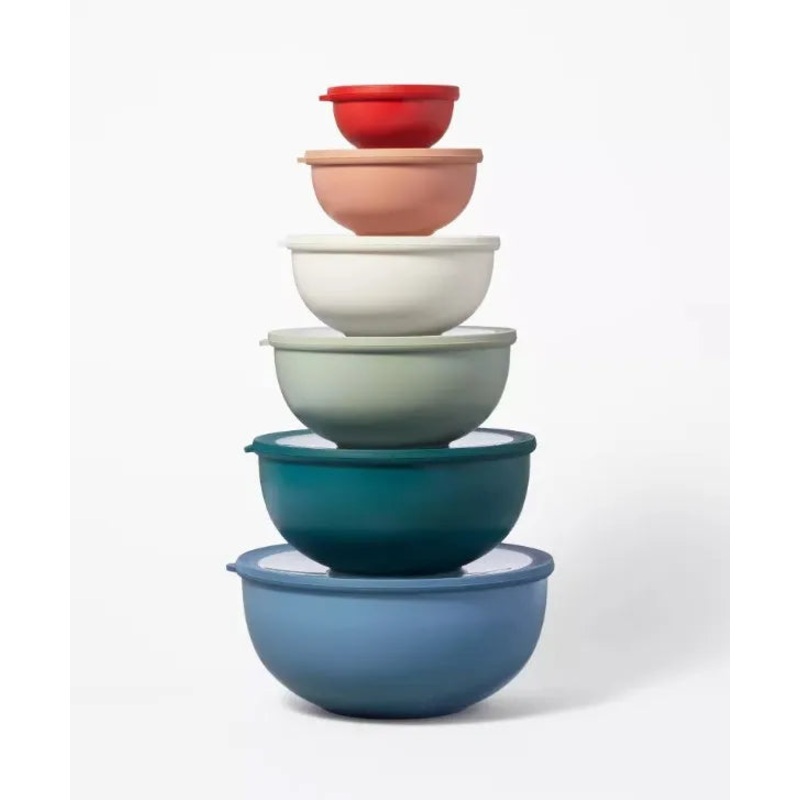 From whisking ingredients to storing leftovers to serving a side dish, leftovers, the Plastic Mixing Bowl Set with Lids from Figmint comes in handy for a range of cooking and kitchen needs. This set of mixing bowls comes with six plastic bowls made of recy