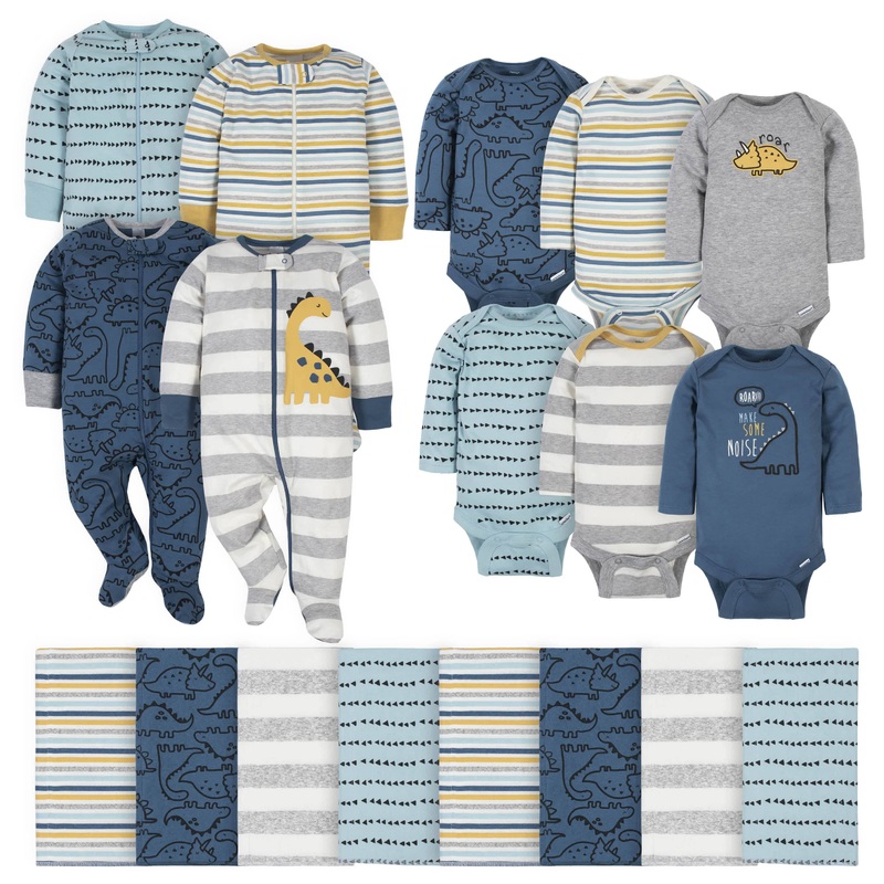 18-Piece Baby Boys Dinosaur Sleep ‘N Play, Onesies Bodysuit, and Burpcloth Set