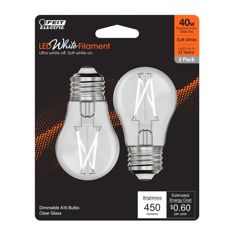Light up your space with these dimmable 40W White Filament LED Light Bulbs. Unlike yellow filaments, these white ones blend into any decorating style for a timeless look that complements any room. They emit 450 lumens of light using only 5 watts – up to 87.5% less energy than standard 40-watt incandescent bulbs.