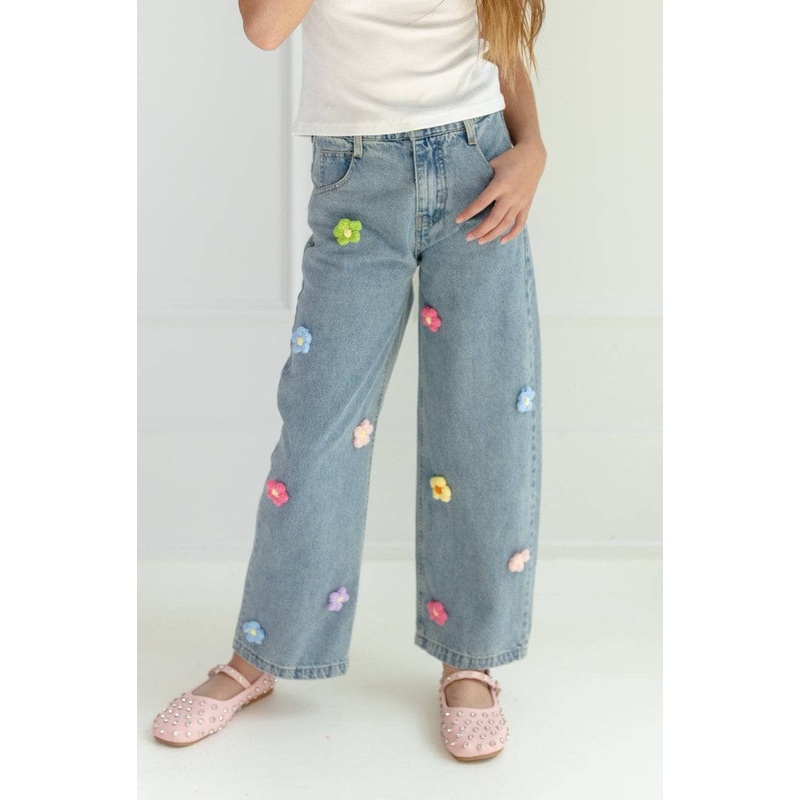 - Classic wide-leg denim jeans decorated with colorful 3D crochet flower appliqus for a standout statement.