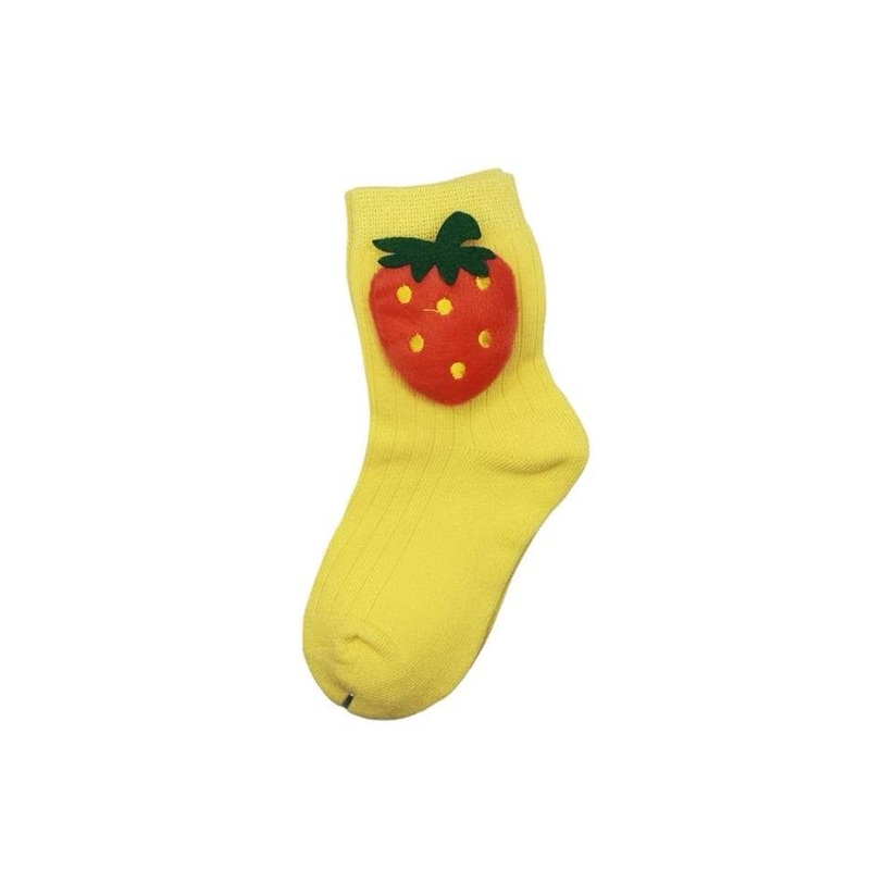 Description:Cheerful yellow socks featuring a 3D strawberry design for a playful and vibrant look.Crafted with a ribbed texture for a snug and comfortable fit.Perfect for adding a fun pop of color to everyday outfits or as a quirky gift option.Material & C