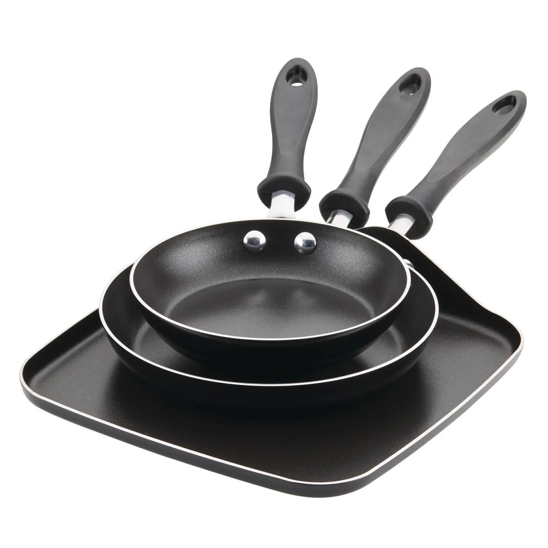 For heavy-duty durability and the power of DiamondMax nonstick, reach for the versatile Farberware Reliance 3-Piece Aluminum Nonstick Cookware Set. Featuring two fry pans and a square griddle, this cookware set is constructed from fast and even heating hea