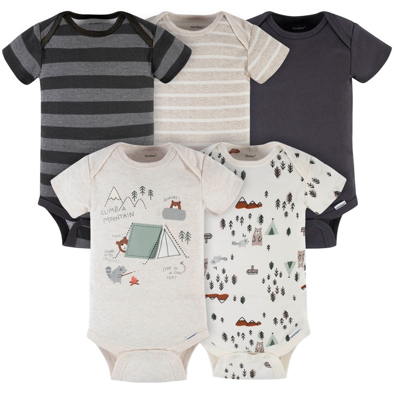 Our Onesies bodysuits are perfect to mix and match with your childs favorite pants, shorts, accessories and more! Each one is designed with an expandable lap shoulder neckline and high-positioned bottom snaps for easy on/off. We had our essentials independently certified with STANDARD 100 by OEKO-TEX so that you dont have to worry about harmful substances in your babys wardrobe. This pack includes five baby boy bodysuits with a black and gray color scheme with camping art.