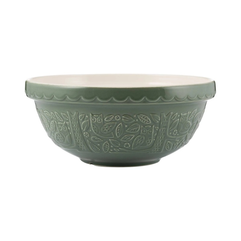 With a 90 Fl Oz capacity, the Mason Cash S18 (11"") Owl Green Mixing Bowl is perfect for cake mixes. Part of the Mason Cash In the Forest range this bowl is embossed with owl forest scenes inspired by folk tales of the mid-19th Century. Made from chip resi