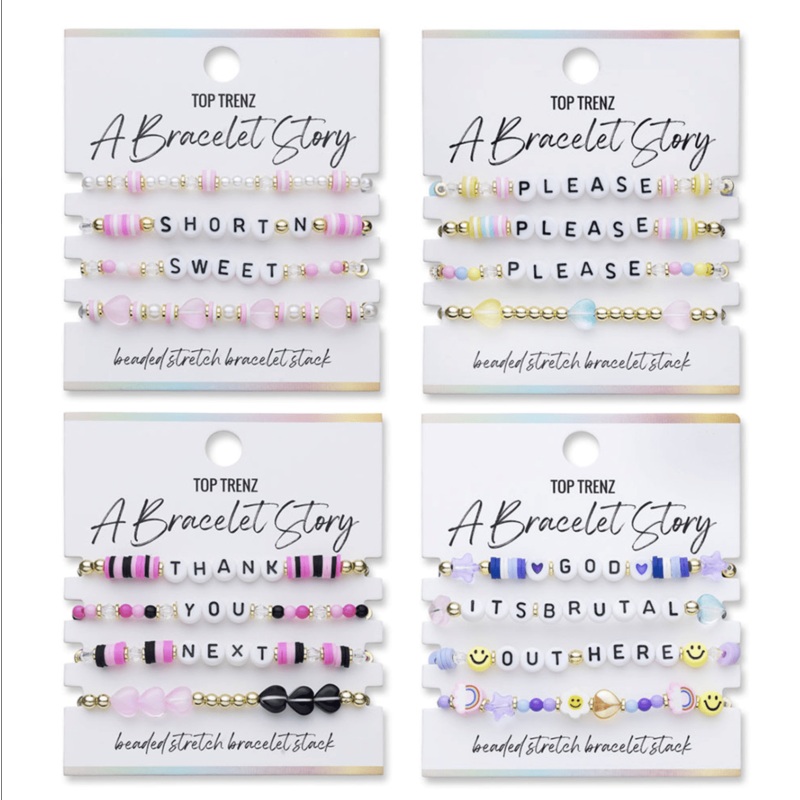 Introducing Bracelet Story: Pop Anthem Edition A new drop inspired by your favorite pop stars and musical artists! Each set includes four stackable bracelets that come together to spell out fun, lyrical phrases like "Short n Sweet," "God, It's Brutal Out H