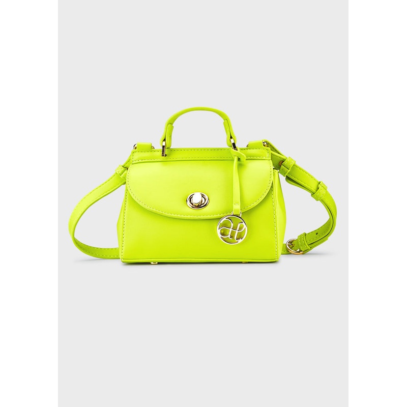 ime green handbag for girls by Spanish brand Abel & Lula, made in soft faux leather with gold-colour hardware. Modern and vibrant, this compact bag has a front flap opening that secures with a twist lock fastening. Finished with the brand’s name on the back, it has a small interior slip pocket and a round logo charm attached to the handle. It can be carried comfortably with a single top handle or worn over the shoulder with the detachable, adjustable strap.