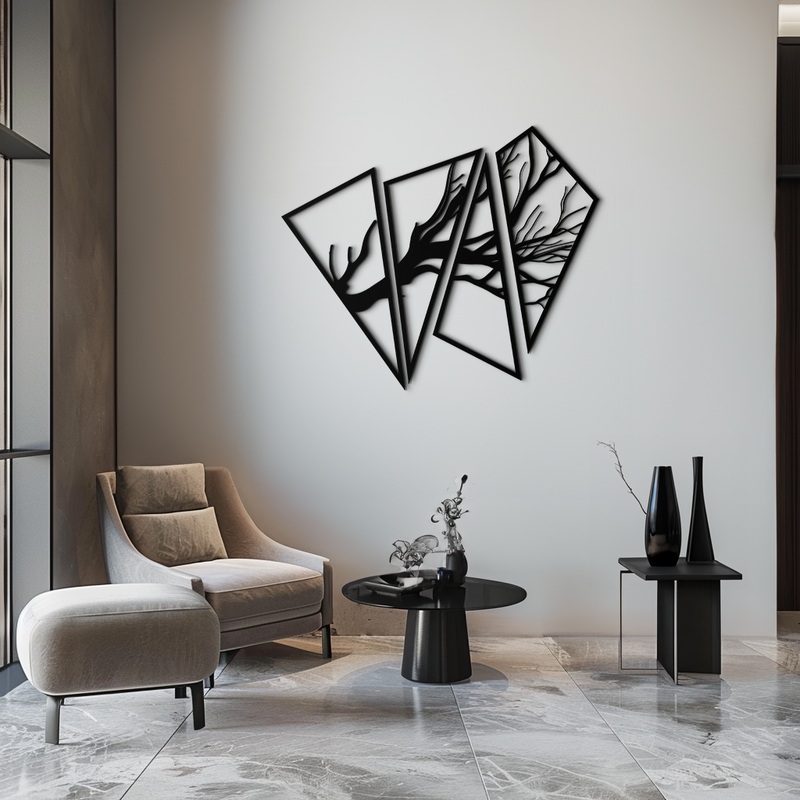 Bring a bold, modern aesthetic into your space with this Abstract Tree Branch Metal Wall Art. This unique multi-panel artwork features a striking geometric interpretation of tree branches, designed for a contemporary and minimalist touch. Precision-cut from 1.5 mm premium steel, this high-quality piece is coated with electrostatic paint, ensuring durability against rust and fading.