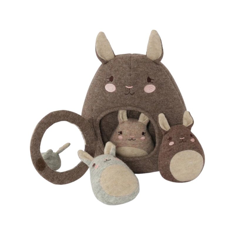 The kangaroo carries three babies inside that all make a gentle jingle sound when played with.The tummy has a velcro closure and a plastic mirror inside. The mothers ears make a crinkle sound.Material: 80% wool and 20% nylon with polyester liningHeight: 20