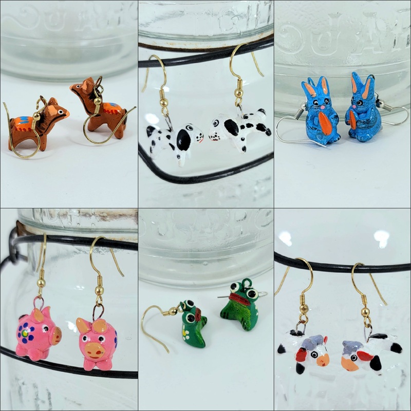 These critters are too cute to pass up! Small hand-painted animal charms measuring between 0.5" and 1" hang from wire fish hook style earring backs. Each pair was handcrafted by at-risk and rescued women in our U.S. Training Center, and your purchase suppo