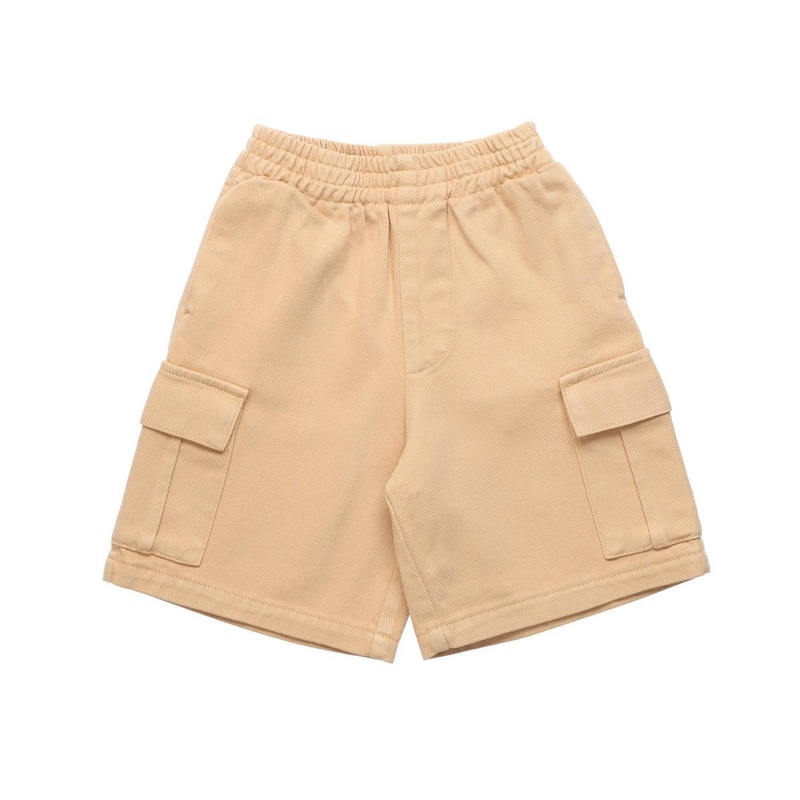 Bermudas with elasticate waistband and patch pockets. Made from organic cotton canvas in camel.