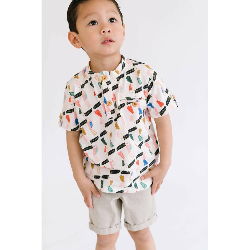 TheAlex Tee is a simple and classic silhouette with the softest cotton fabric they'll always want to wear. Featuring a short sleeve, and a Henley style button in front and a tab detail on the sleeve. Basics, upgraded!Printed in our Toucan Play pattern by d