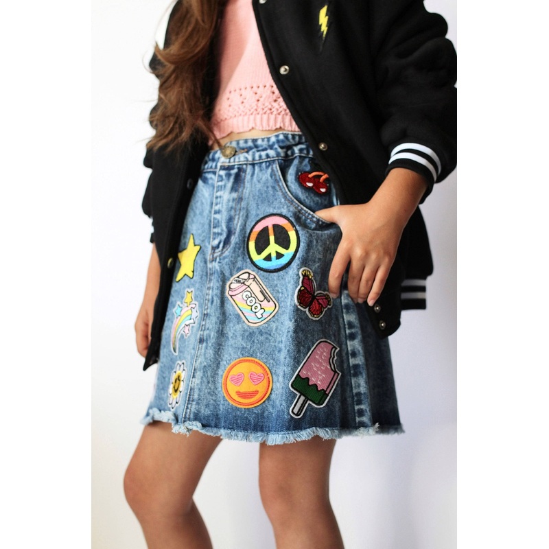 - This fun and playful denim skirt is covered in vibrant, colorful patches that add personality and charm to any outfit. Each patch brings a unique element, creating a one-of-a-kind statement piece.