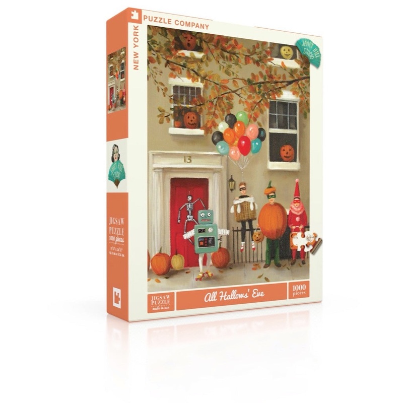 Some trick-or-treaters, including a robot, air balloon, pumpkin, and a clown, head out to collect some candy on Halloween night.