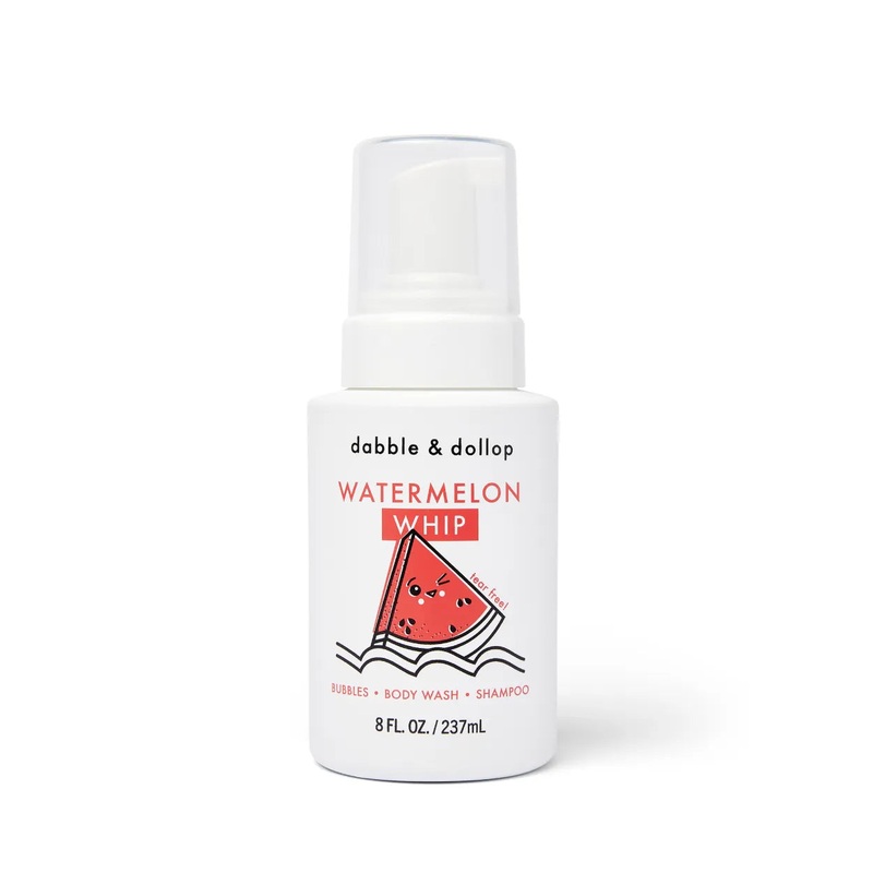 8oz of all-natural, tear-free, foaming, Watermelon Whip 3-in-1 Shampoo, Body Wash & Bubble Bath. Made in the USA without any artificial fragrance, colors, or dyes.