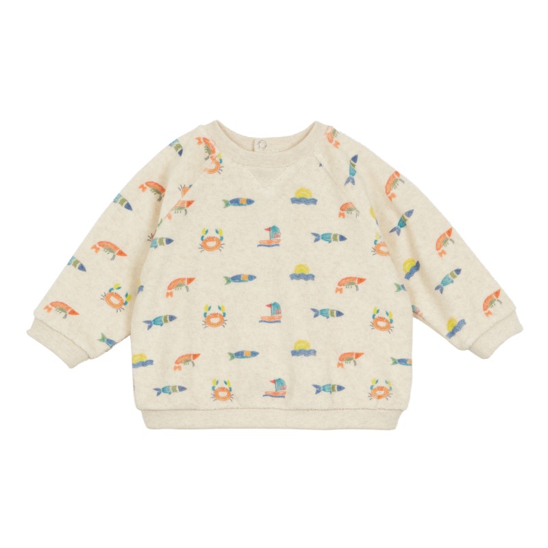 arsne & les pipelettes baby sweatshirt with fish print. this organic cotton baby sweatshirt has a cute fish print all over, raglan sleeves and snaps at the back.