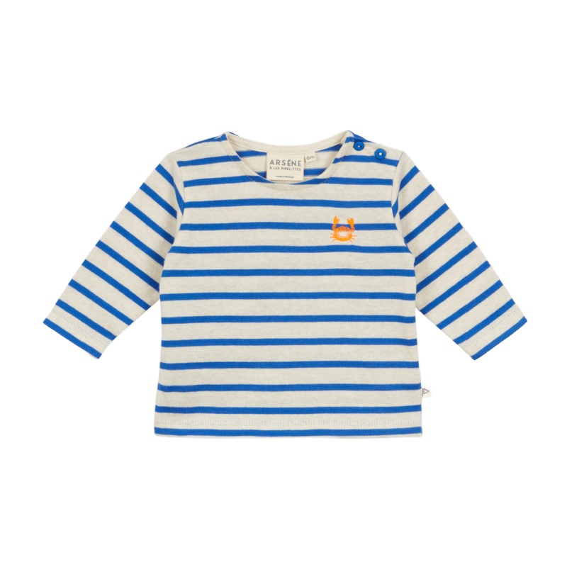 arsne & les pipelettes filiz baby mariniere shirt in electric blue. this organic cotton knit baby mariniere buttons at the shoulder and has a cute orange crab embroidered on the chest.100% organic cottonmade in portugal