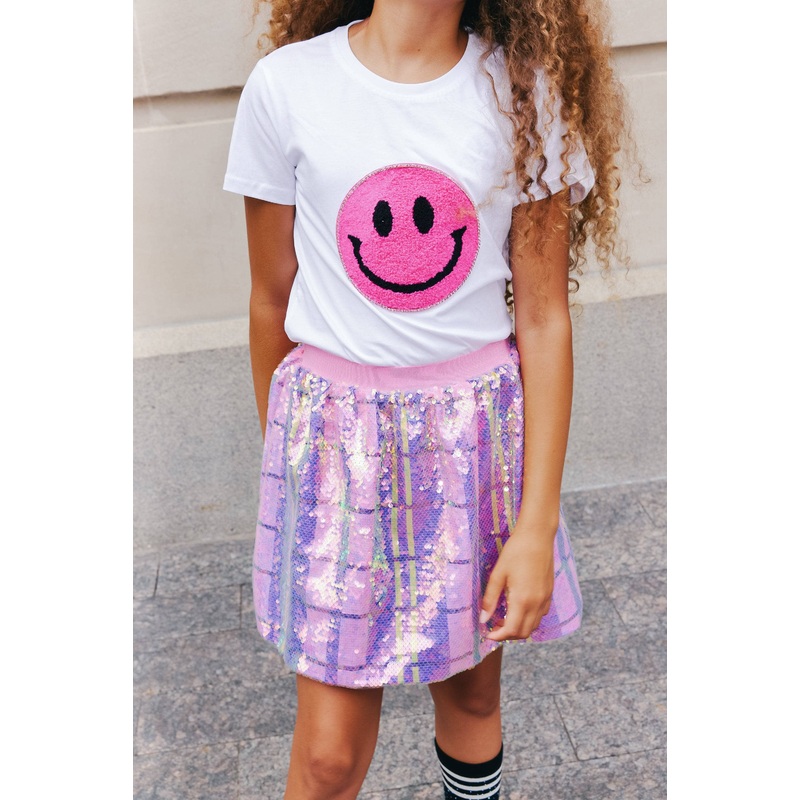 - Eye-catching plaid skirt adorned with shimmering sequins in vibrant pink and multicolor hues.