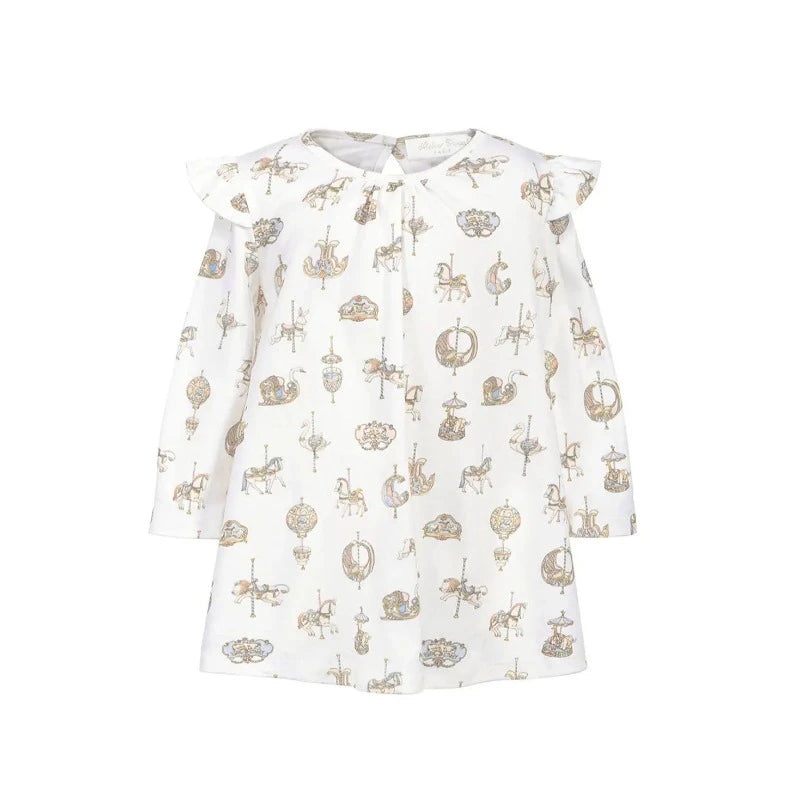 enchant your little one with the whimsical print of our atelier choux baby jersey dress! inspired by the charming carousels of france, this dress features long sleeves and playful ruffles at the shoulder.