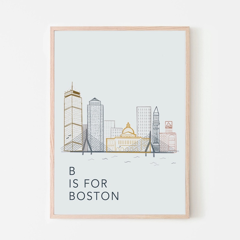 Instill some Boston pride while teaching the letter B with this “B is for Boston” art print. Hand drawn, this print features some of Boston’s most famous buildings and monuments like the Leonard P. Zakim Bunker Hill Memorial Bridge, the Massachusetts State House, the Prudential Tower, the Boston Clock Tower, and the Citgo Sign.