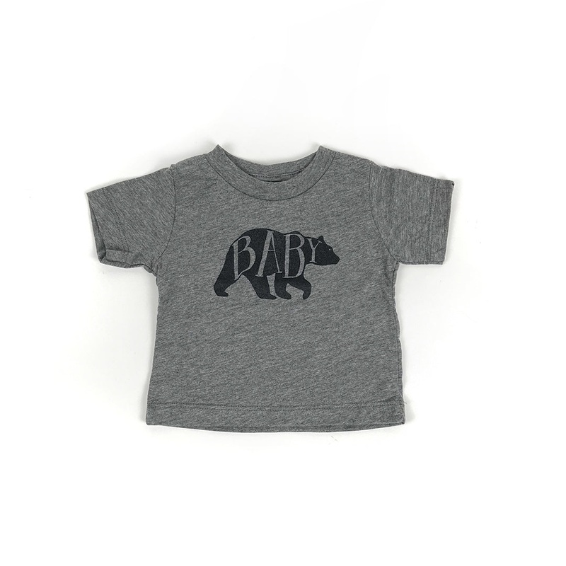 A perfectbaby gift!Featured against the dark silhouette of a bear, "Baby Bear" says it all.These super-soft 100% organic cotton t-shirts and onesies are screen-printed by Ohio-based studio, Gladfolk. We love the simple, modern designs of these shirts and o