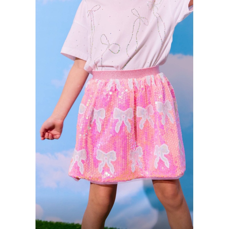 Description:Sparkling pink skirt adorned with baby blue sequin bows, creating a whimsical and glamorous lookFlared skirt add a charming silhouette, perfect for special occasionsEye-catching sequins for a playful, dazzling effect thats sure to make a statem