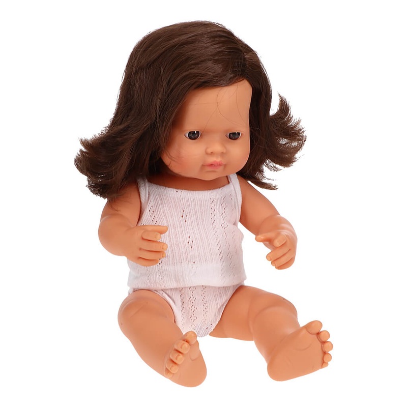 MinilandBrunette Girl15″ Dollis anatomically correct, which means that they show the physical differences between boys and girls in a realistic way. They are made of soft and flexible vinyl. They are articulated and scented with a light vanilla aroma. Perfect to raise childrens awareness of diversity and inclusion, encouraging the values of equality, integration, and acceptance.