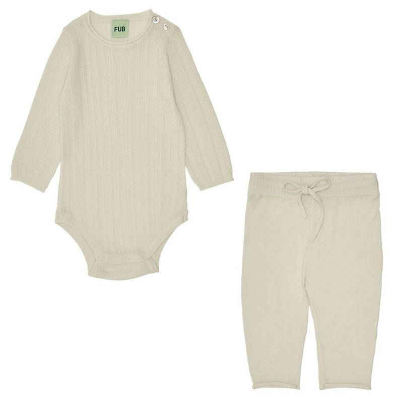 Knitted in an irregular rib structure this baby body is designed with long sleeves, round neckline with a roll-edge and rib hems. It has a practical button closure at shoulder with pearl shell buttons and snap fasteners at the crotch. Cut with a low crotch and straight legs, these baby pants are knitted in a light-weight single jersey. The pants feature rolled bottom hems and a ribbed waistband with drawstring casing, that ensures a comfortable and adjustable fit. The body & pant is made from extra fine merino wool. FUB’s merino wool is BLUESIGN certified, free from harmful chemicals and comes from non-mulesed sheep.100% OEKOTEX and BLUESIGN certified merino wool