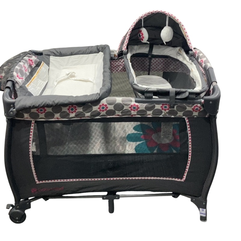 Condition: Gently Used Set up a safe play and sleep space for your baby with this great playard. With a bassinet and changing station you will be set as soon as your bring your little one home. The play yard features 2 levels, one for newborns up to 6 mont