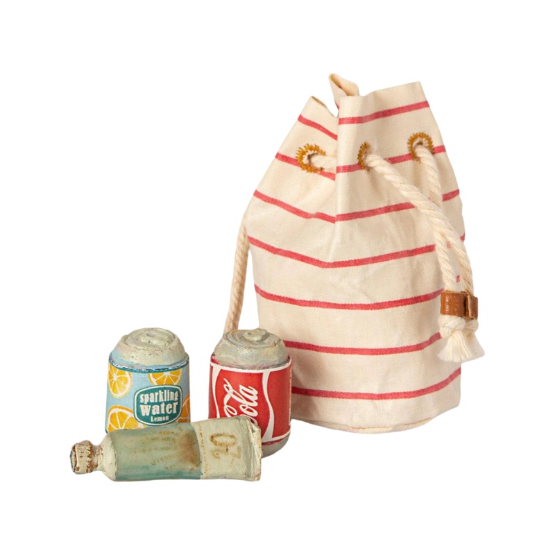 Vacation time! This small bag includes all must-haves for a day in the sun: sunscreen and 2 sodas. All made in miniature size that fits the smallest Maileg friends. Please note that the sunscreen and soda cans can not be opened.
