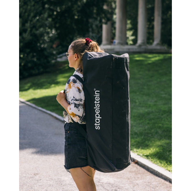 Store your Stapelstein safely with this practical travel bag. Perfect for on-the-go play, travels and outdoor adventures. This canvas bag keeps up to twelve Original elements neatly stacked, clean and protected. Did you know that a full bag of Stapelstein weighs less than half of your childs backpack? Simply sling over their shoulder for a comfortable fit and limitless fun.