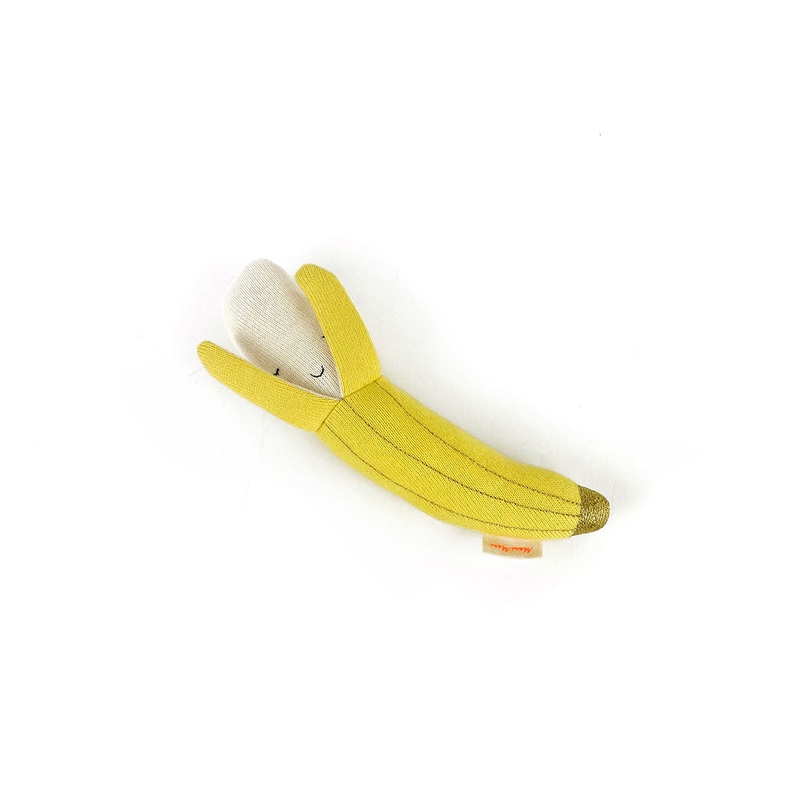 What is it thats so cute about this little rattle? Perhaps its the sweet smiling face from behind the banana peel Whatever it is, your baby will love holding it, chewing on it, and rattling it. Made of soft organic cotton.
