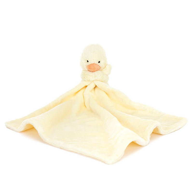 Sweet, gentle Bashful Duckling Soother is a perfect newborn gift, rolled up and presented in a Baby Jellycat grosgrain ribbon. Featuring our most loved farmyard friend, soft in a pale yellow fur made from recycled fibers and holding on tight to a smooth, un-stuffed square shaped soother; a simply gorgeous cuddle companion.