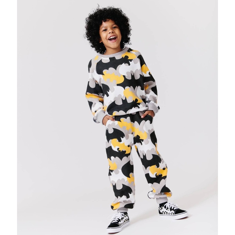 • Bold and dynamic, this Batman camo print set features iconic bat silhouettes in a trendy black, grey, and yellow design.