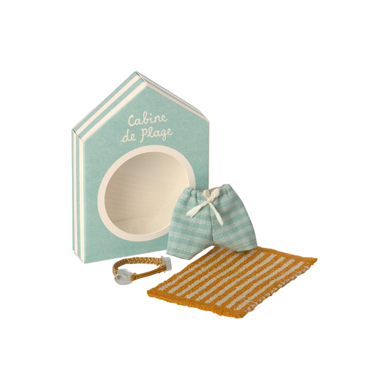 Vacation time. This set includes all essential accessories for a fun day at the beach: trunks, goggles, and a towel. It all fits the mice in size big brother/sister perfectly.
