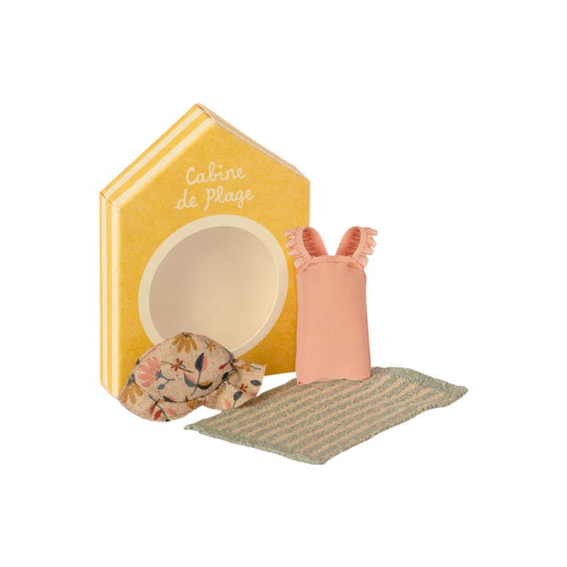 Vacation time! This set includes all essential accessories for a fun day at the beach: a bathing suit, sunhat, and a towel. It all fits the mice in size big brother/sister perfectly.