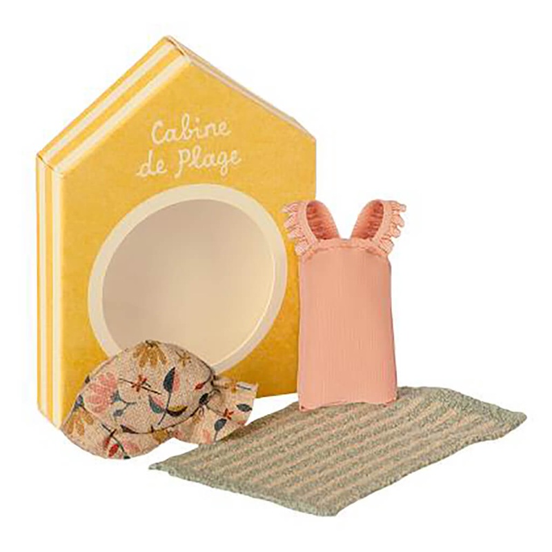 Vacation time. This set includes all essential accessories for a fun day at the beach: a bathing suit, sunhat, and a towel. It all fits the mice in size big sister perfectly.Maileg Beach Set for Big Sister Mouse Details:Material: Linen, Cotton, Polyester*B