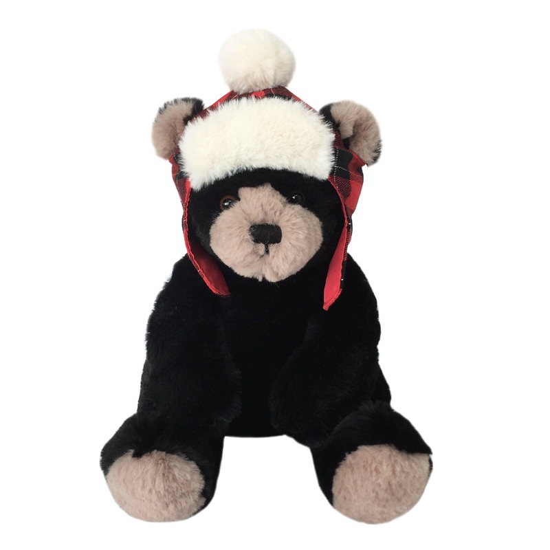 Bern the Black Bear is ready for the winter! Adorned in a red buffalo plaid trapper hat, luxurious fur, he is the ultimate cuddle buddy!