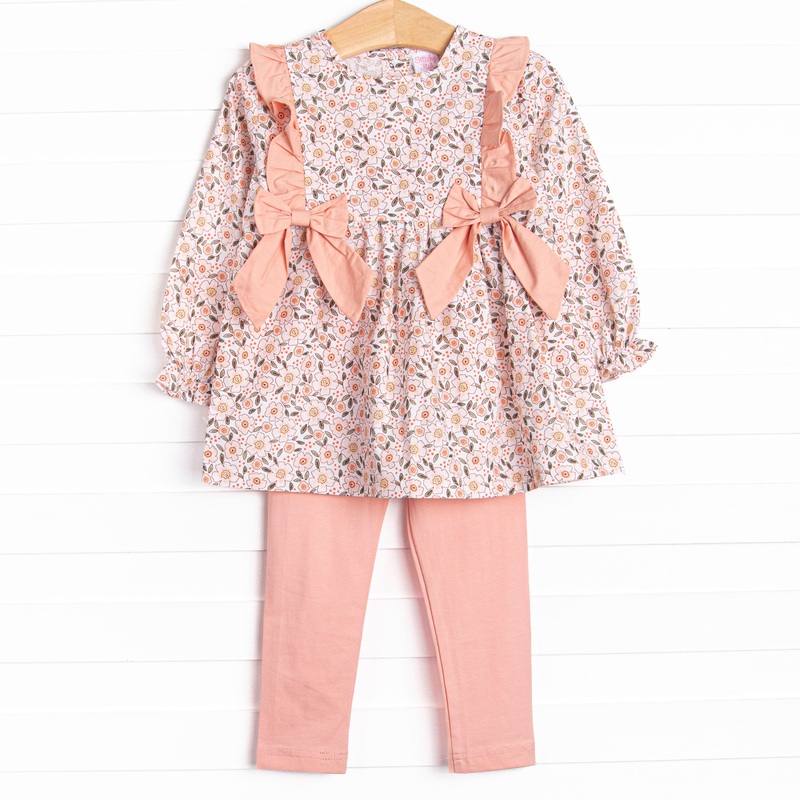 Bring on the berries and bows! This set is featured in a lovely pink floral pattern with pink bow details. Coordinating pink leggings to match. This darling set is bound to be one of her favorites!