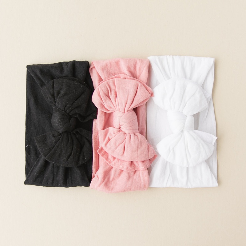 A set of our three best selling baby bands: midnight black, bright white and rouge.Save 10% when buying in a set!Our baby bands are a wrap style bow made out of high quality nylon.Each bow measures approximately 4.5" x 3 on a stretchy nylon band that fits