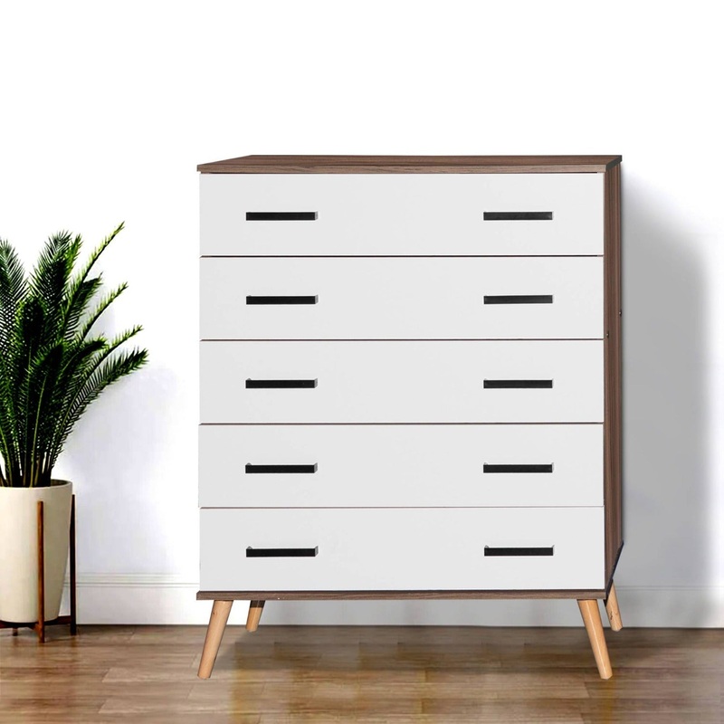 Better Home Products Eli Mid-Century Modern 5 Drawer Chest in Walnut & White – Better Home ELI-WC14-0018-WALNUT-WHT :