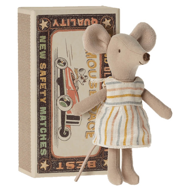 Ready to play for hours, this mouse is sound asleep in a small matchbox.The clothes and bed linen are made of soft fabrics with unique prints and beautiful colors. Big Sister Mouse wears a beautiful sleeveless striped dress.Maileg Big Sister Mouse Doll in