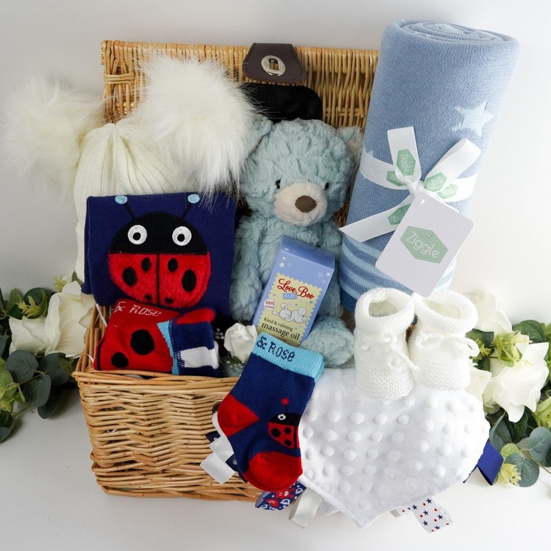 Blade and Rose Ladybird Baby Leggings, Matching Top & Socks, Luxury Baby Boy Gift Hamper Basket, Ziggle Blue Star Soft Knitted Baby Blanket, Baby Teddy Bear, Corporate Baby Gift