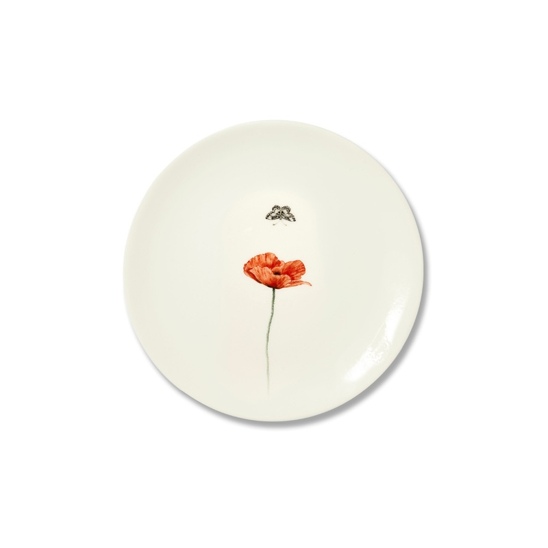Entirely handcrafted and hand-decorated by artisans at the Milanese ceramic workshop Paravicini, delicate and refined, these flat dishes will add an accent of sophistication to a modern dining set. The Bloom Collection is handcrafted of white thin ceramic, features 12 different flowers, and elegant butterflies.