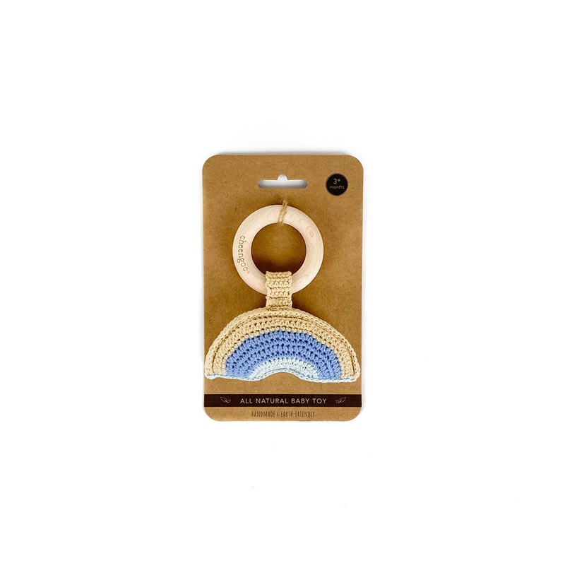 This sweet hand-crochetedBlue Rainbow Rattle with wooden teething ring is made with all natural materials: untreated 100% FSC certified maple wood wrapped in 100% cotton yarn and filled with corn fibers.It’s aperfect organic and eco-friendly gift.