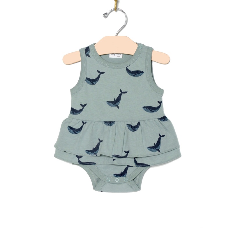 Make a splash with this Blue Whales skirted bodysuit. Crafted from 100% combed jersey cotton, this playful tank bodysuit features a fun blue whale print and convenient snaps at the crotch and neck for easy changing. Dive into comfort and cuteness for your