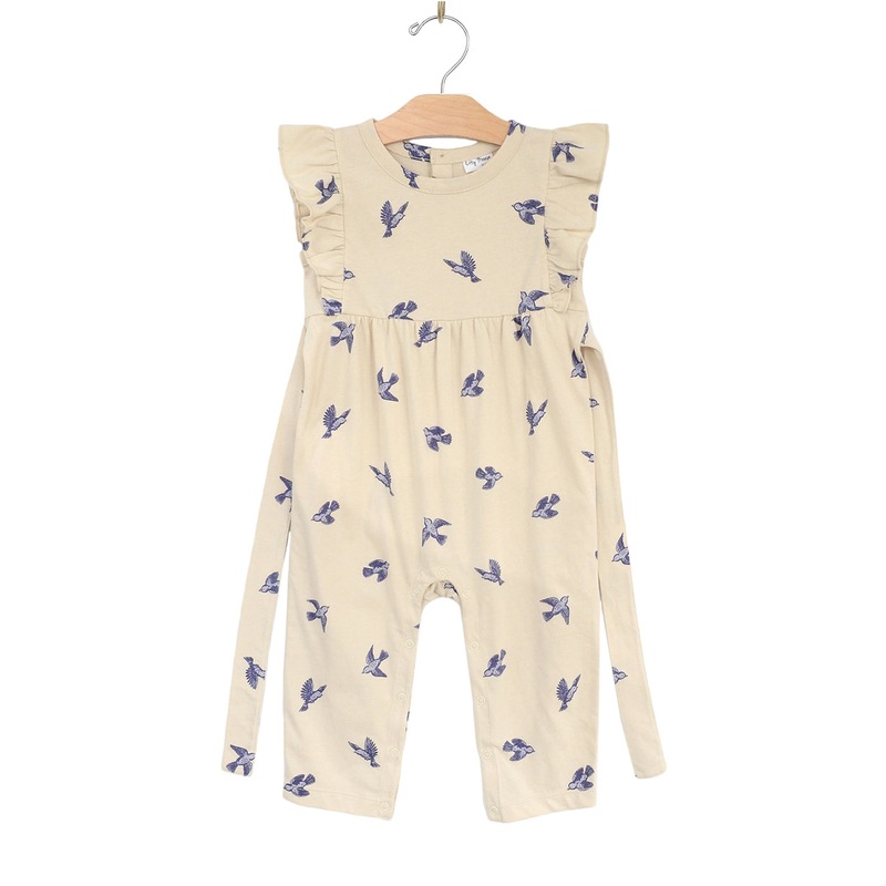 City Mouse’s best-selling long leg romper in 100% combed cotton jersey and this charming bluebirds print. Featuring flutter sleeves, a tie-bow back, and snaps along the legs for easy changing.