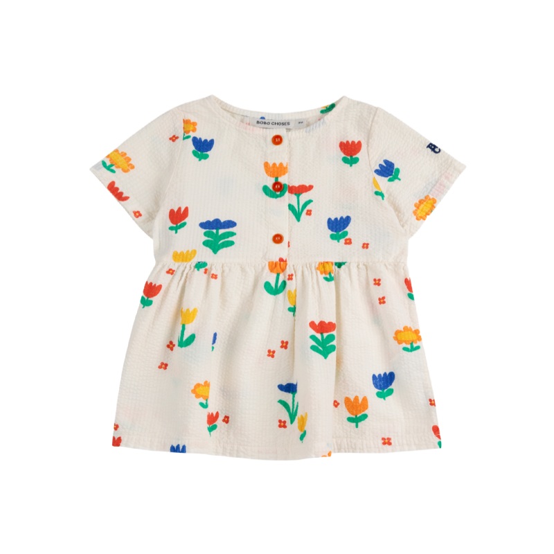 the bobo choses garden party all over baby dress is a soft, light dress with a playful flower print all over. this cheery baby dress has red buttons on the front and the bc logo on the sleeve.100% cottonmade in spain
