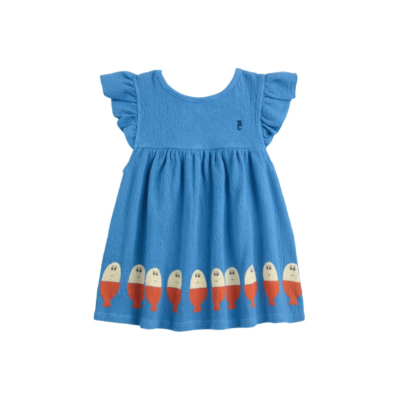 the bobo choses morning egg ruffle baby dress is a stretchy style with a wrap design in the back dressing. this pretty blue dress has cute little eggs for a border at the hem.96% organic cotton, 2% elastane, 2% polyamide,made in spain